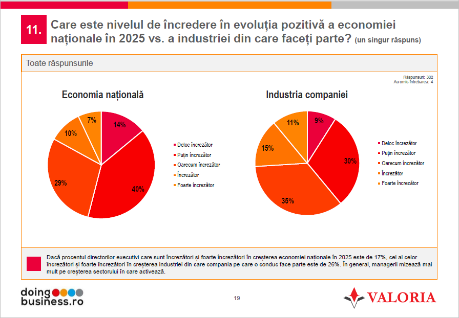 Privind spre 2025, doar 17% dintre directorii executivi sunt încrezători sau foarte încrezători în creșterea economiei naționale, în timp ce 26% au aceeași perspectivă asupra industriei din care fac parte.