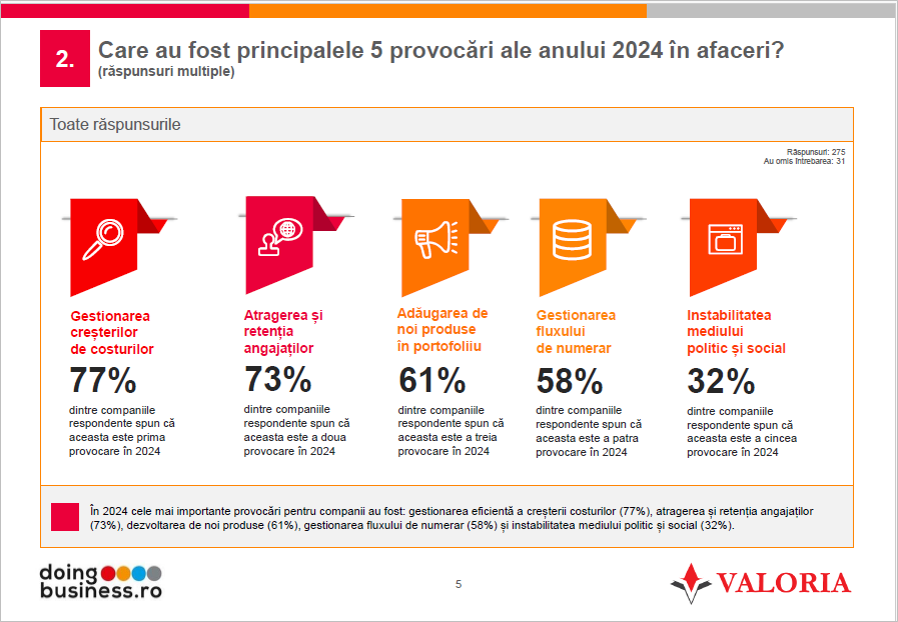 Principalele provocări pentru companii au fost gestionarea creșterii costurilor (77%), atragerea și retenția angajaților (73%), digitalizarea și automatizarea proceselor (61%), gestionarea fluxului de numerar (58%) și instabilitatea mediului politic și social (32%).